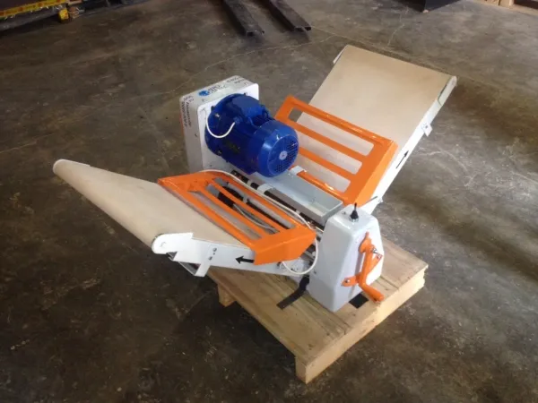 На транспортеры устанавливается специальная конвейерная лента итальянского производства, состоящая из 2-х тканевых прокладок(полиэфир-хлопок) с прослойкой из термопластичного ПВХ. В нерабочем состоянии транспортеры можно складывать и фиксировать в вертикальном положении. Скребки, очищающие раскатывающие валки, выполнены из неметаллического материала, что обеспечивает лучшие условия трения, по сравнению со стальными скребками, которые применялись ранее. В приводе раскатывающих валков ранее вращение от электродвигателя осуществлялось при помощи зубчатой передачи. В настоящее время зубчатые колеса заменены на клиноременную передачу, что значительно уменьшило шум при работе, снизило себестоимость продукции и упростило техническое обслуживание при ремонте.